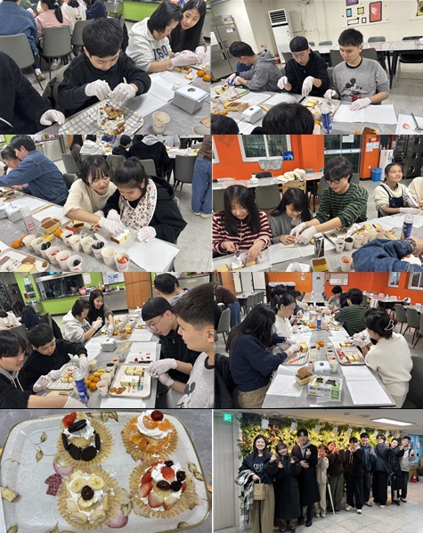 봉사자분들과 이용인들이 케이크를 만들며