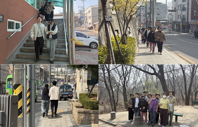 이용인과 봉사자분이 산책로를 걸으며 다양한 이야기로