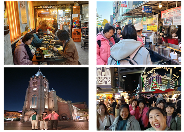 호텔에서의 휴식도 만끽하고, 광장시장, 청계천, 명동, 명동성당도 함께 즐겼습니다. 명동 번화가에서 크레페도 먹고, 맛있는 저녁식사도 했습니다.