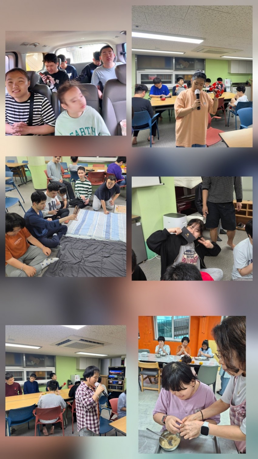 추석 연휴를 맞이하여 10월 5일부터 10월 9일 명절 즐기기 송편 만들기, 드라이브, 윷놀이 및 넌센스 퀴즈, 목욕탕 즐기기, 한빛 노래자랑, 한빛 노래방 등 다양한 프로그램이 진행되었으며 명절 기간 모두가 함께 웃고 추억을 나누는 소중한 시간을 지냈습니다.