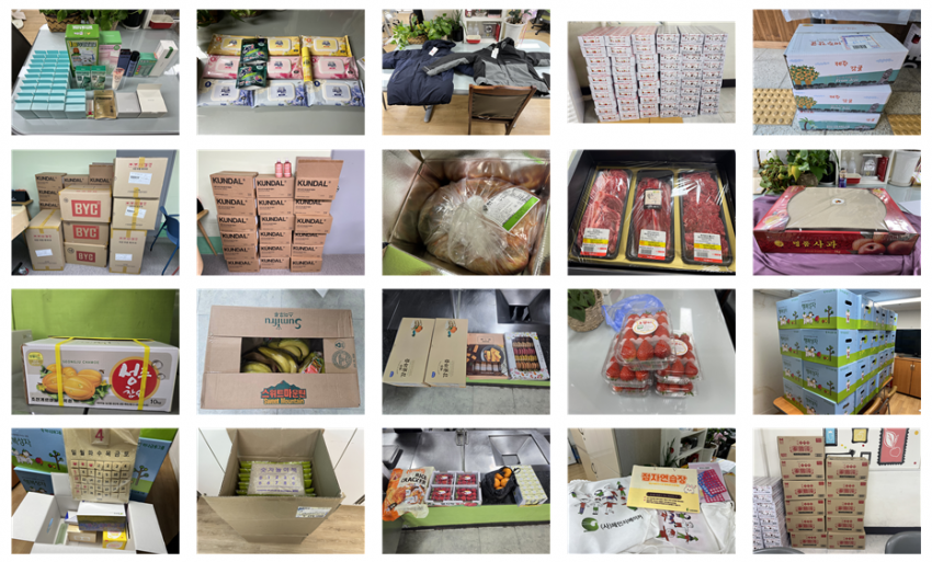 내복, 종이용기(서울시장애인복지시설협회), 소고기선물세트(개인후원자), 과일(뉴힐링라이프), 과일(개인후원자), 에어컨클리너(강북푸드뱅크), 기부세트(사단법인좋은변화)